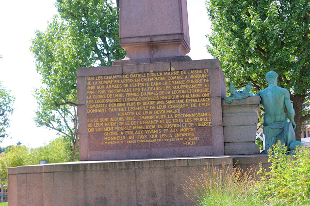 My favorite part about visiting Luxembourg was seeing the Gelle Fra, or Golden Lady. It is a war memorial, a Monument of Remembrance. The monument includes a 69 foot obelisk and a bronze statue on top of The Queen of Freedom. There are also bronze figures at the base of the statue representing soldiers. It was inaugurated in 1923. You can read more about Gelle Fra at Luxembourg's tourism website here: Gelle Fra