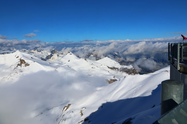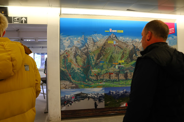 Piz Gloria is a restaurant that rotates 360 degrees every 45 minutes and is 9,744 feet above sea level. If you've seen the 1969 James Bond movie "On Her Majesty's Secret Service" you have seen Piz Gloria, inside and out. Inside the building there are plenty of reminders of James Bond and the movies, including a life-size cardboard cut-out of James Bond. And be sure to use the bathrooms while enjoying brunch in the revolving restaurant! The bathrooms are a one-of-a-kind James Bond adventure! On the lower level of the building you can visit Spy World. There are a lot of fun James Bond activities, including sitting in a bobsled and helicopter, and watching clips from the movie. You can walk on the Skyline Walk and on the Thrill Walk on the Birg cable stop, although I admit that I did not -- my fear of heights prevented it!